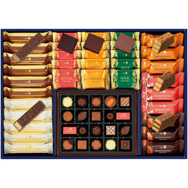 ファンシーチョコレート20、ミルフィーユ3種9、プレーンチョコレート3種15、チョコレートウエハース2種11