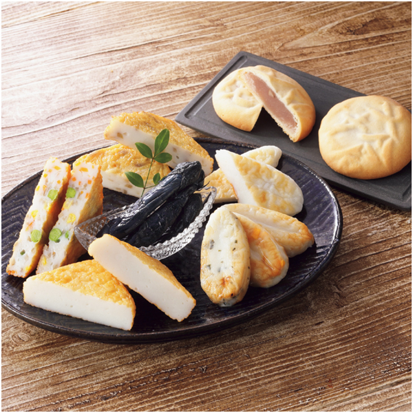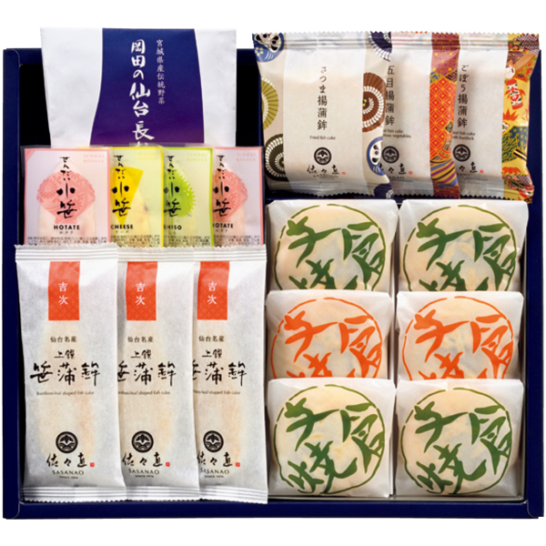 笹蒲鉾吉次3、せんだい小笹(ほたて入2、しそ入、チーズ入)、揚蒲鉾(さつま、五目、ごぼう)、支倉焼6、仙台長なす漬70g