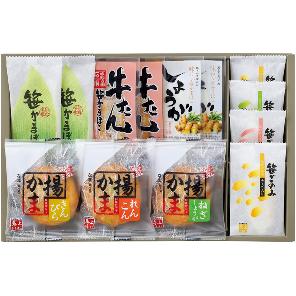 笹かまぼこ・牛たん笹かまぼこ・しょうが笹かまぼこ 各2、笹ごのみ(チーズ入2、えび入、しそ入)、揚かま(きんぴら、れんこん、ねぎしょうが)