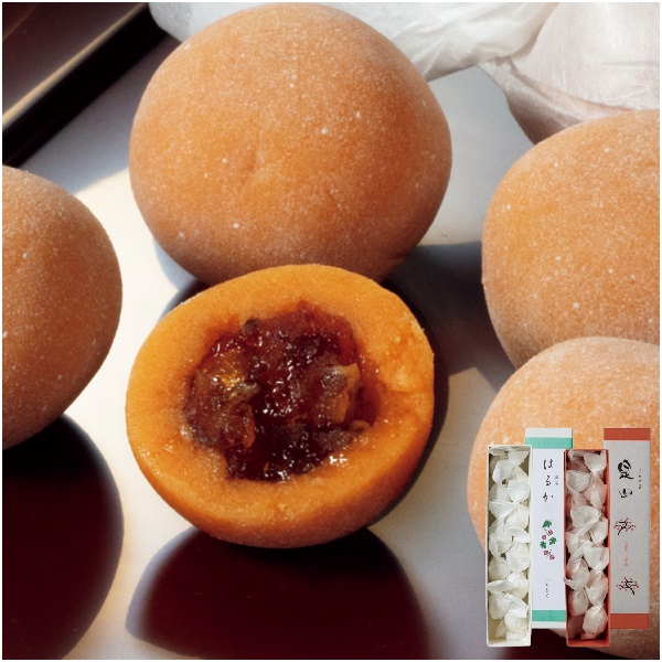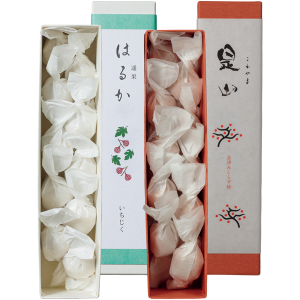 ドライいちじくを甘さを抑えた白あんで包んだ新商品の一口菓子のはるかと、会津みしらず柿の上品な甘さを表現した是山の詰合せ。