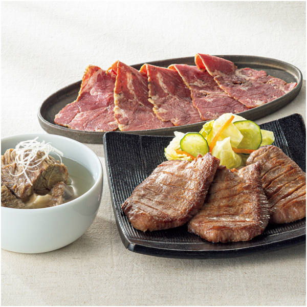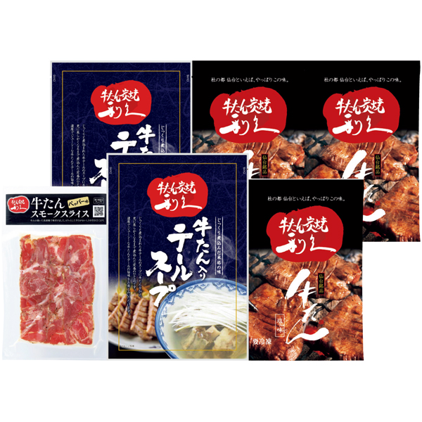 牛たん塩味100g×3(原料:牛たん/オーストラリア産)、牛たん入りテールスープ250g×2、牛たんスモークスライスペッパー味60g(各原料:牛たん/オーストラリア又はアメリカ又はカナダ産)