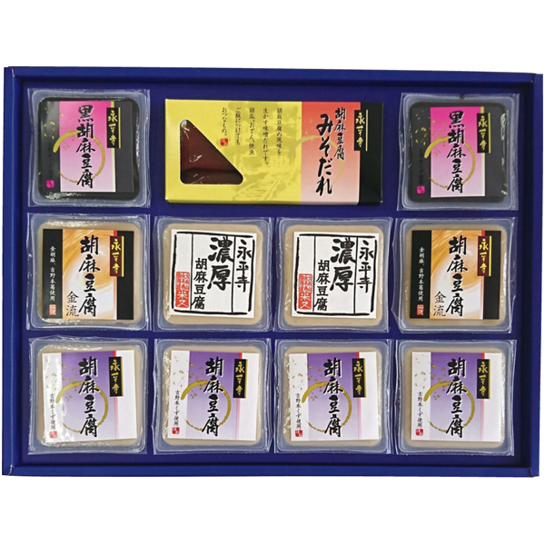 濃厚胡麻豆腐100g×2、胡麻豆腐(白)100g×4、胡麻豆腐(黒)100g×2、胡麻豆腐(金流)100g×2、みそだれ12g×10