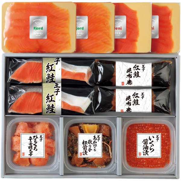フィヨルドサーモンスモークスライス50g×2、紅鮭スモークスライス50g×2、あわびと数の子松前漬カップ70g、いくら醤油漬カップ50g、辛子明太子カップ70g、アラスカ産塩紅鮭60g×2、紅鮭昆布巻130g×2