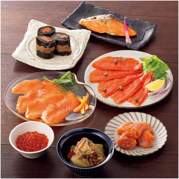 脂ののったスモークサーモンや切身、さまざまな魚卵を詰合せた、世代を問わず支持されるバラエティセット。