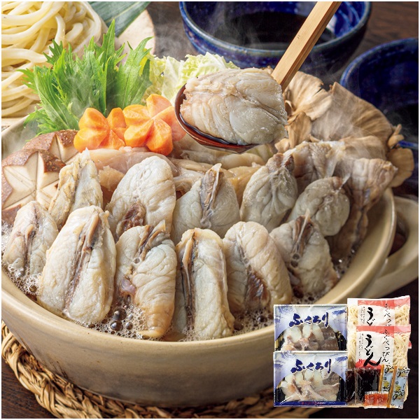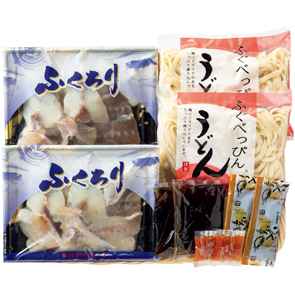 まふぐちり250g(身140g、アラ110g)×2、ふぐべっぴんうどん250g×2、ふぐ鍋だし45g×2、ポン酢35g×2、モミジオロシ3g×2