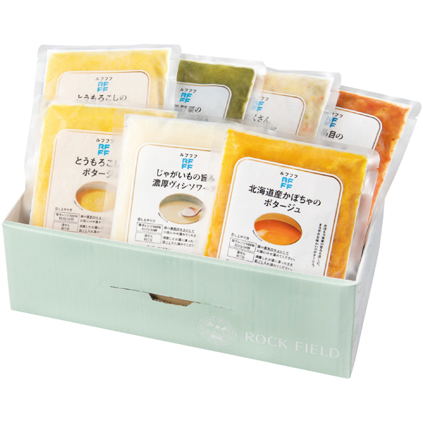 10種野菜のグリーンポタージュ180g、とうもろこしのポタージュ180g×2、具だくさんクリームチャウダー230g、15品目のミネストローネ230g、じゃがいもの旨み 濃厚ヴィシソワーズ180g、北海道産かぼちゃのポタージュ180g