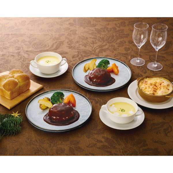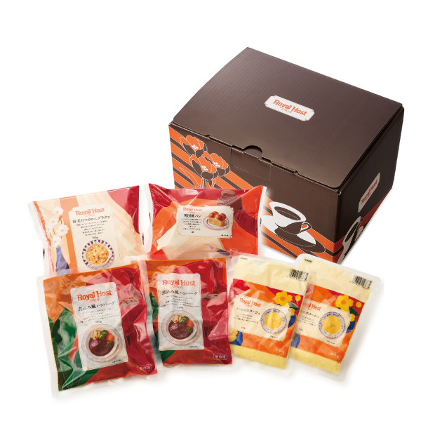 洋食の定番「煮込み風ハンバーグ」、海老の旨みが味わえる「海老のマカロニグラタン」、コーンの甘みを楽しめる「コーンのポタージュ」と、「英国風パン」を詰め合わせました。「Royal Host Deli」の人気のメニューが揃ったセットです。